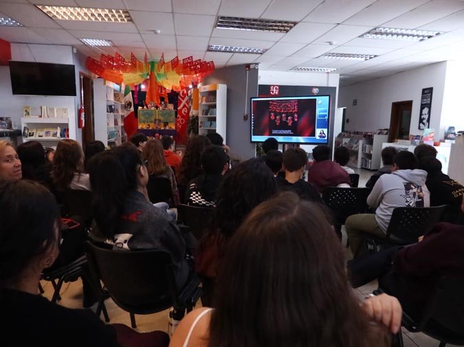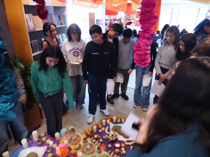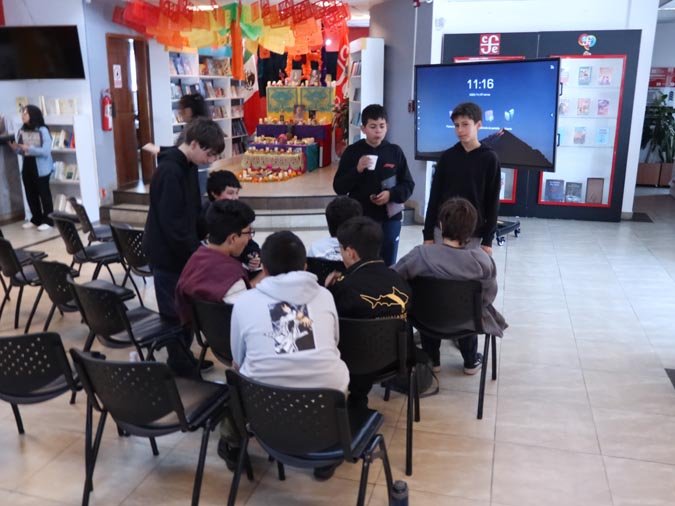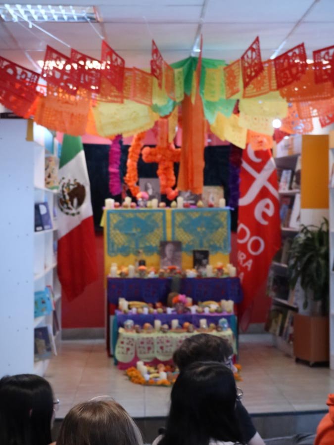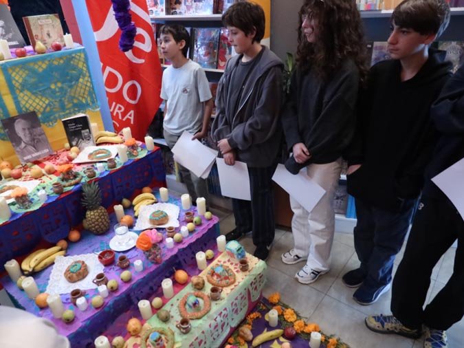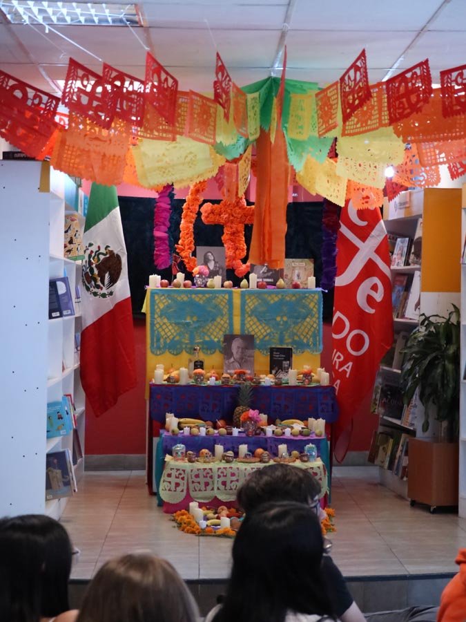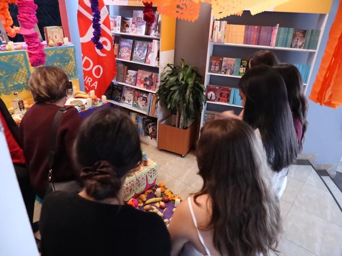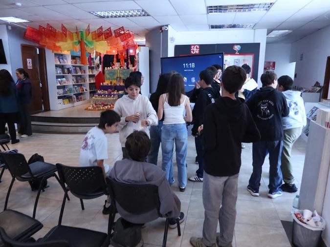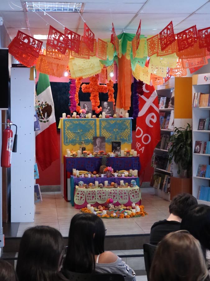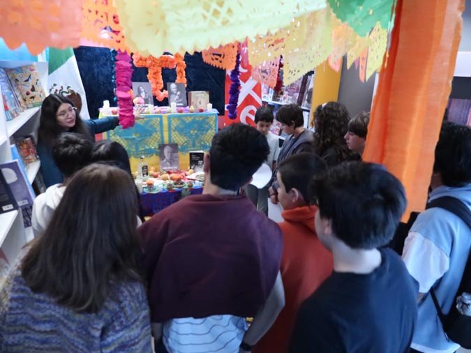 Los participantes fueron recibidos por un altar de muertos magníficamente decorado, símbolo central de esta tradición. Gracias a libros ilustrados del Fondo de Cultura Económica y a una actividad práctica, los estudiantes pudieron reflexionar sobre cómo la literatura y el arte pueden honrar los recuerdos y celebrar la vida. El taller, con una duración de 50 minutos, se caracterizó por un ambiente tanto estudioso como creativo, donde cada uno pudo expresarse y compartir sus reflexiones.
