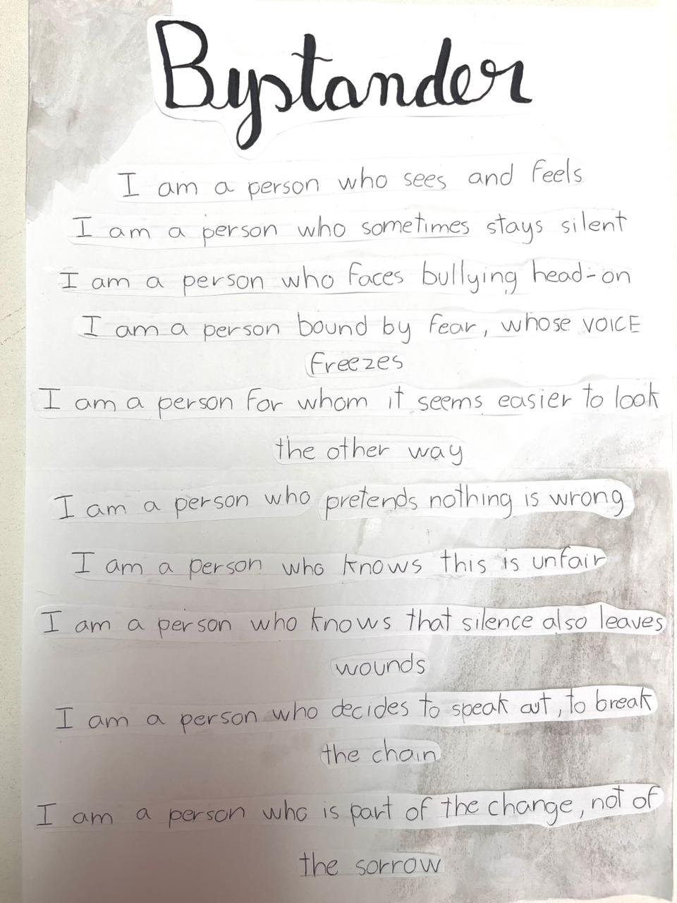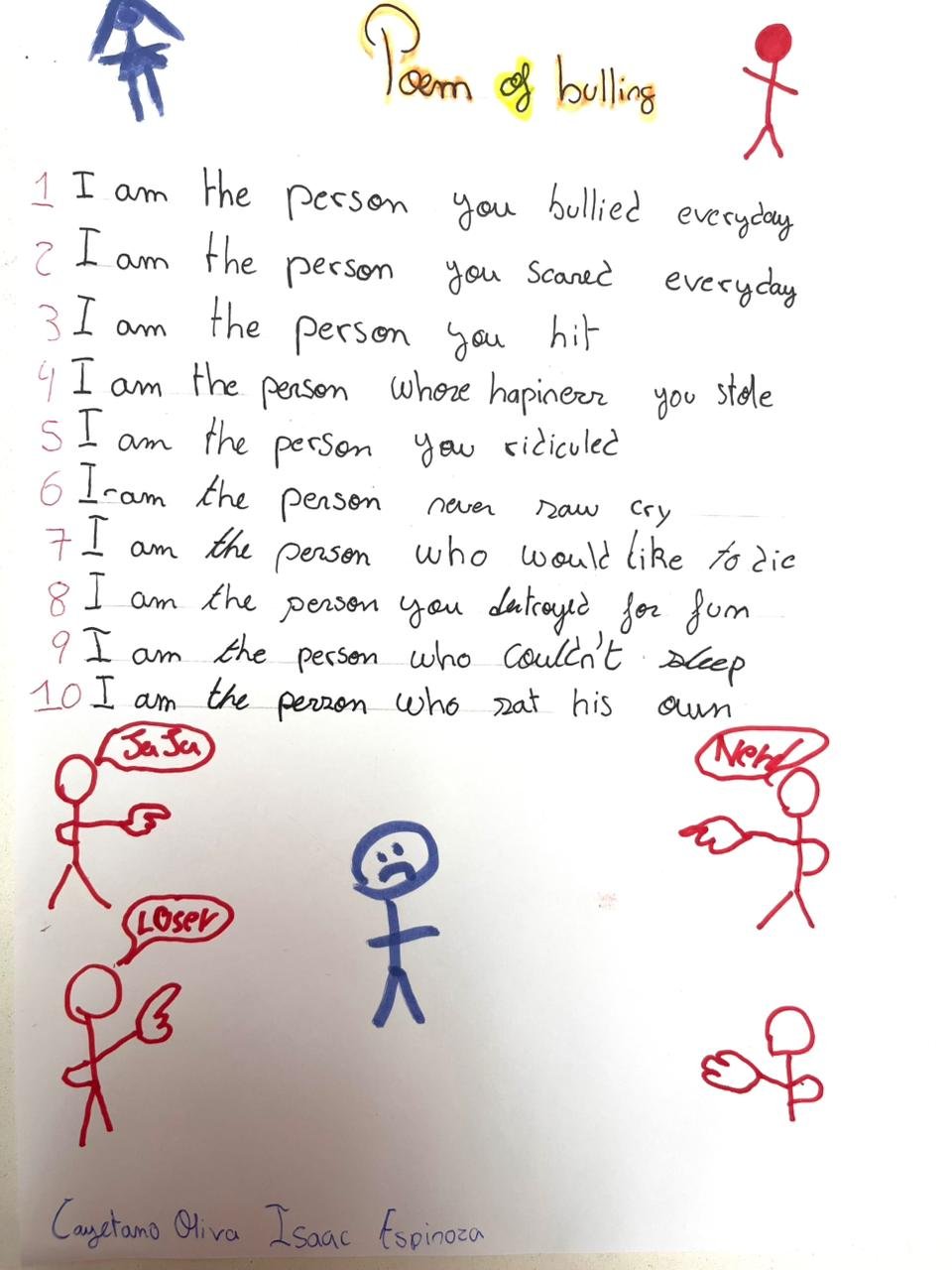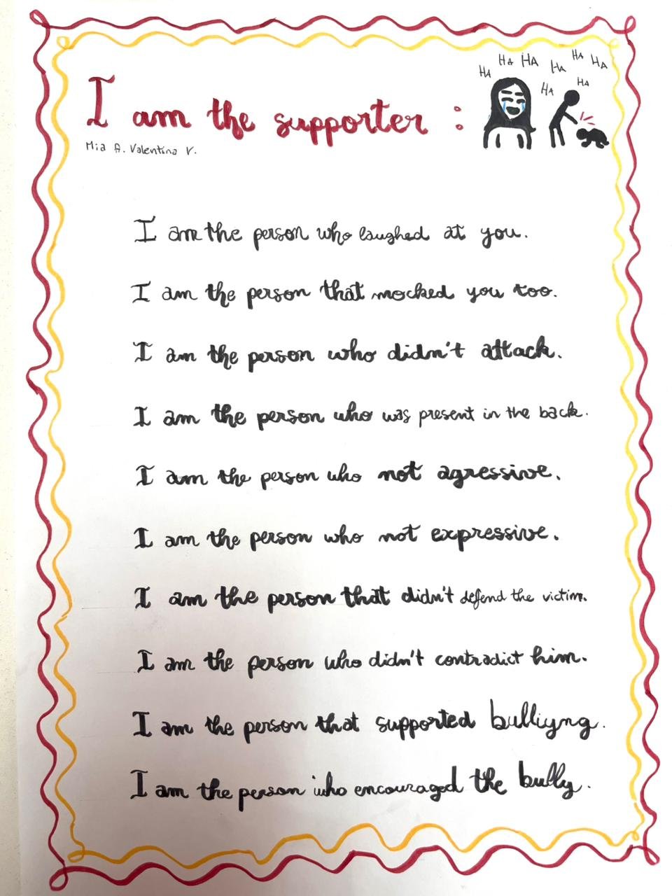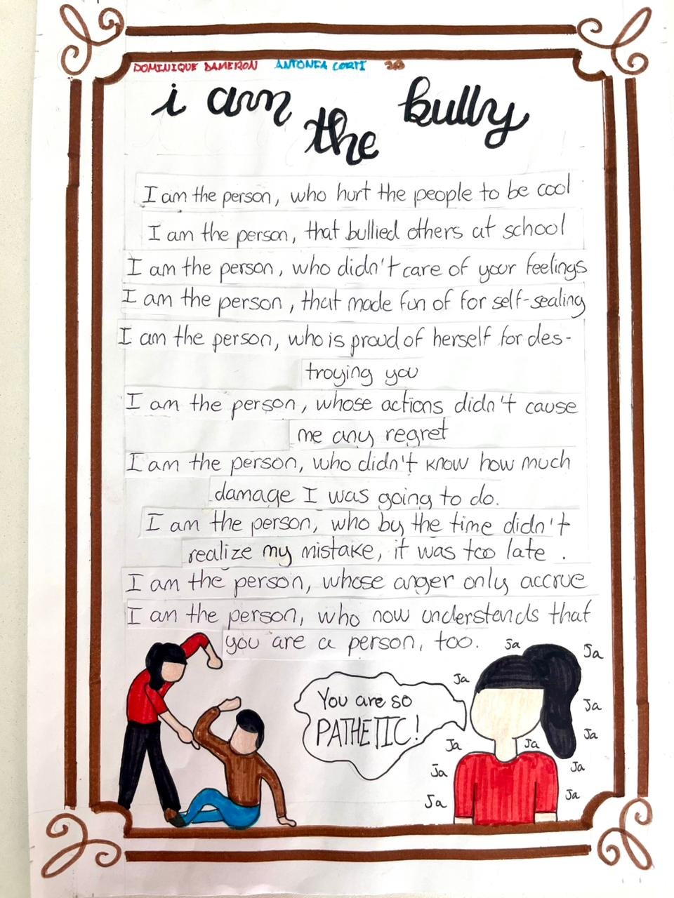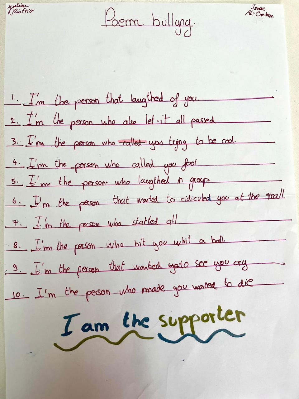 El proyecto concluyó con el análisis del poema «I am the person», una obra sensible que inspiró a los alumnos a escribir sus propios poemas, respetando la rima y buscando transmitir emociones auténticas. Guiados por su profesora, expresaron sus sentimientos, sus reflexiones y su compromiso con un clima escolar más benévolo y respetuoso.
