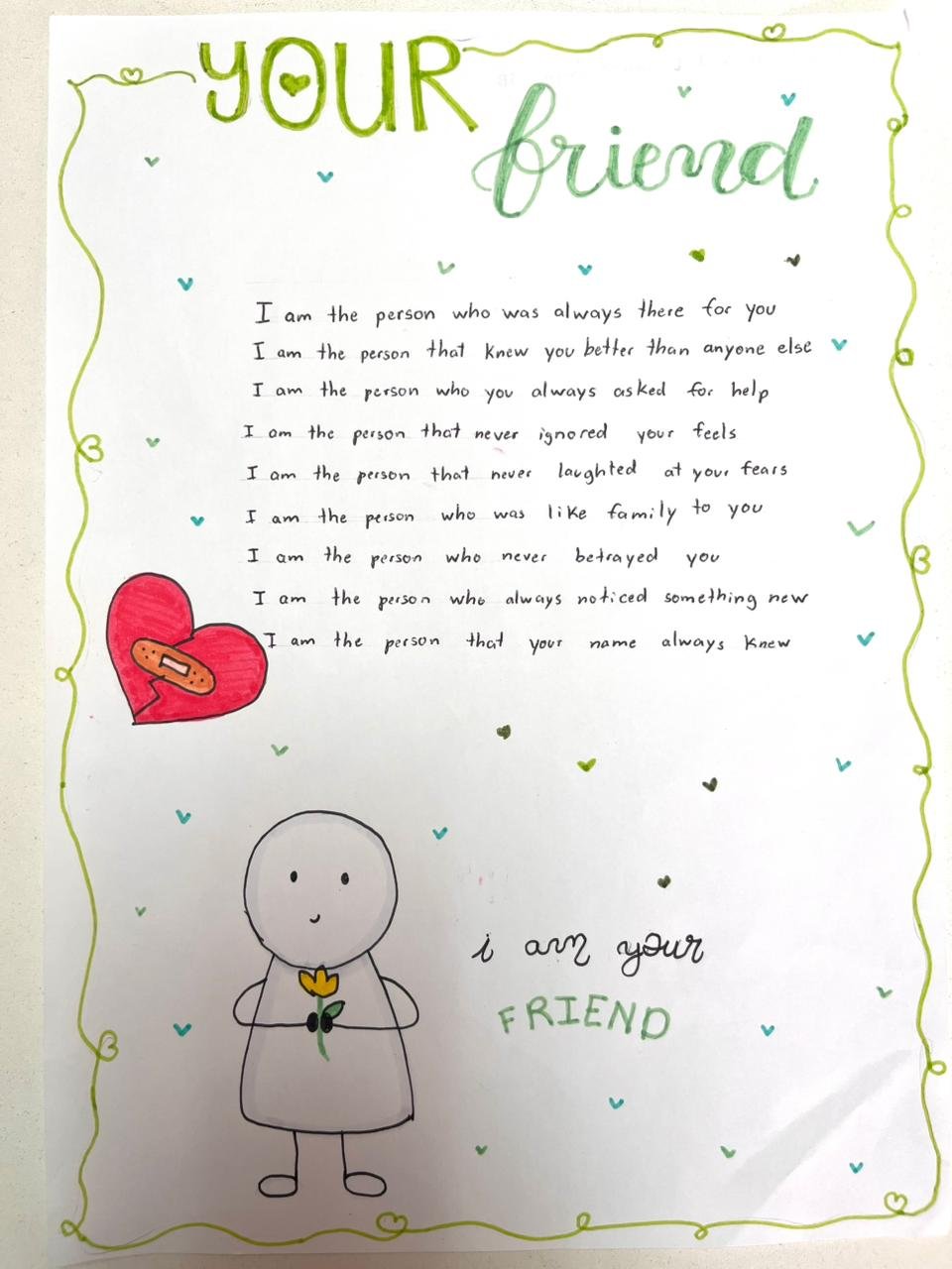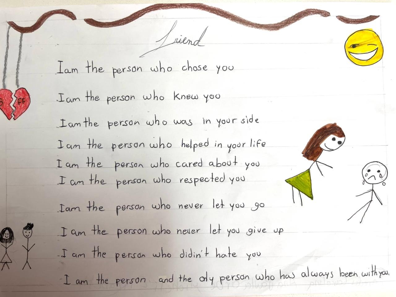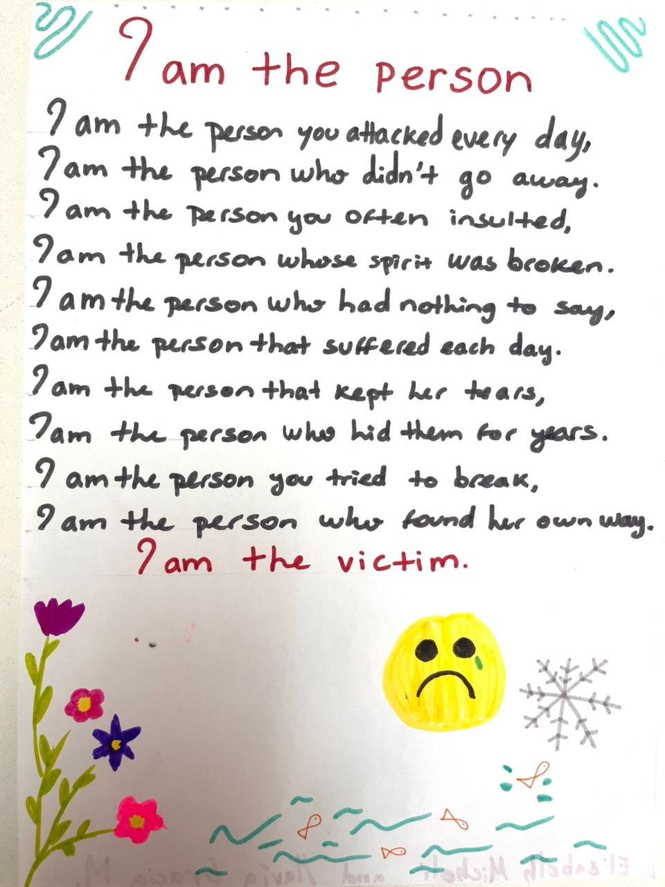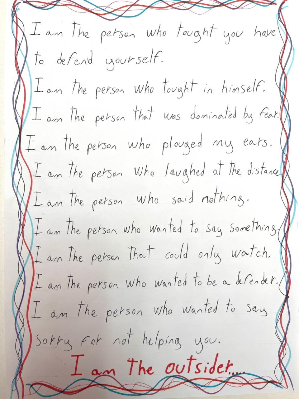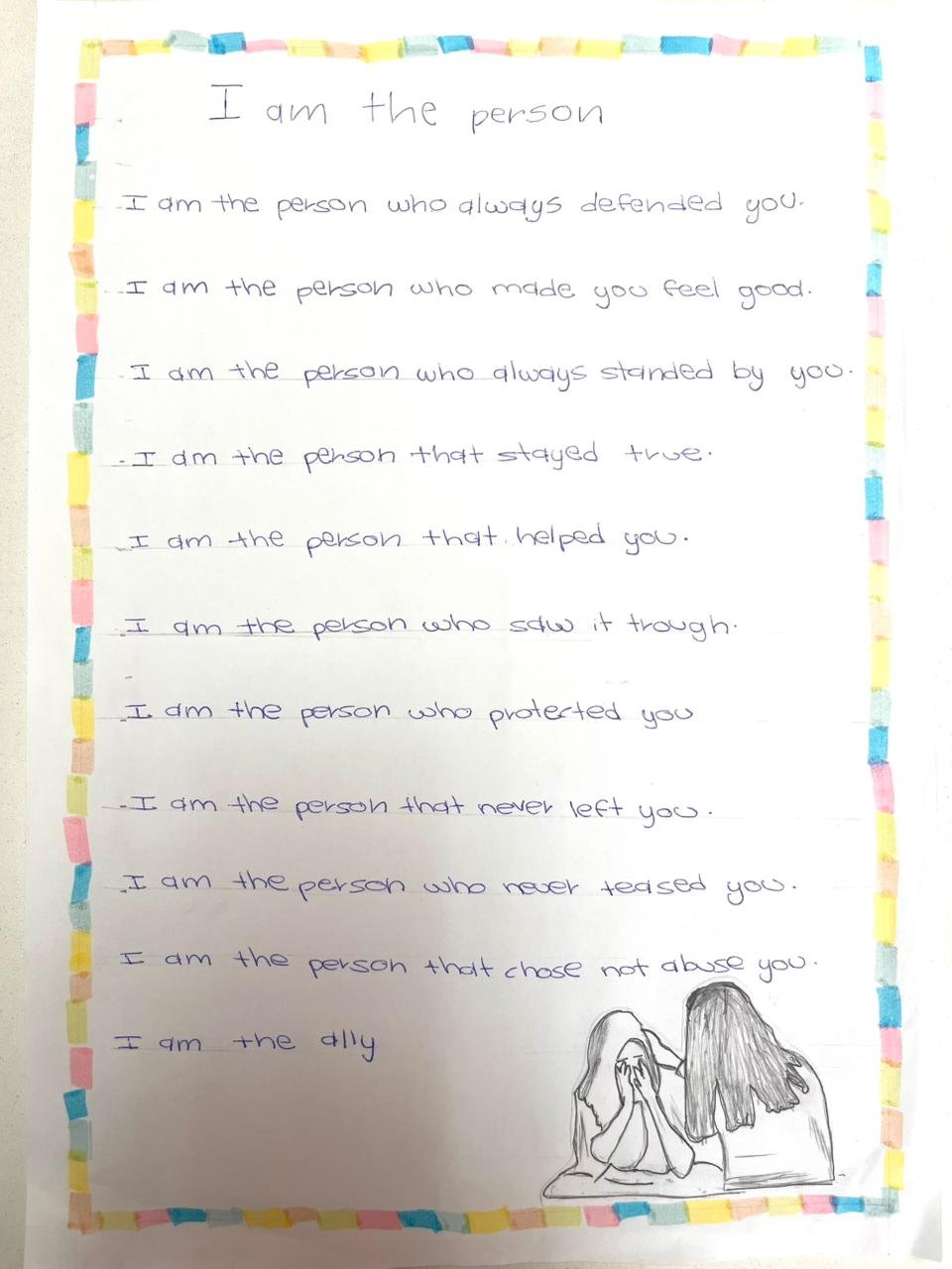 El proyecto concluyó con el análisis del poema «I am the person», una obra sensible que inspiró a los alumnos a escribir sus propios poemas, respetando la rima y buscando transmitir emociones auténticas. Guiados por su profesora, expresaron sus sentimientos, sus reflexiones y su compromiso con un clima escolar más benévolo y respetuoso.