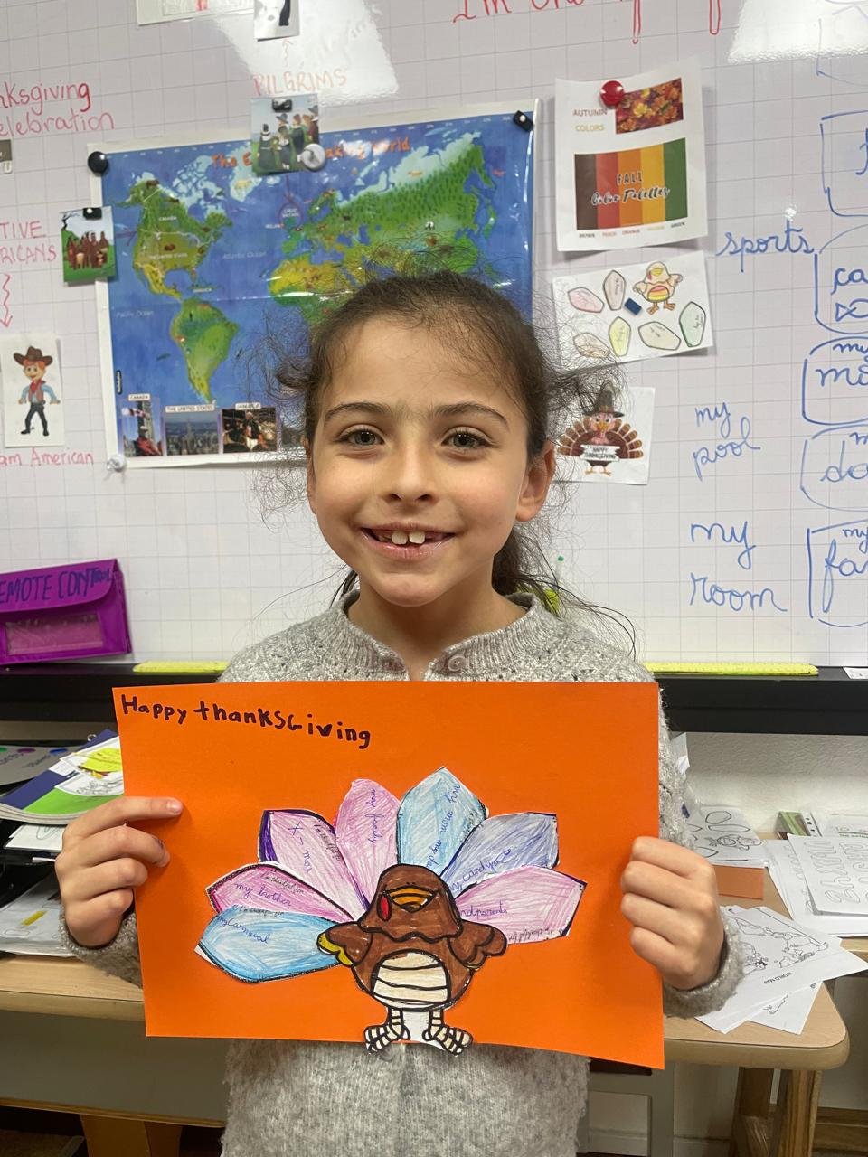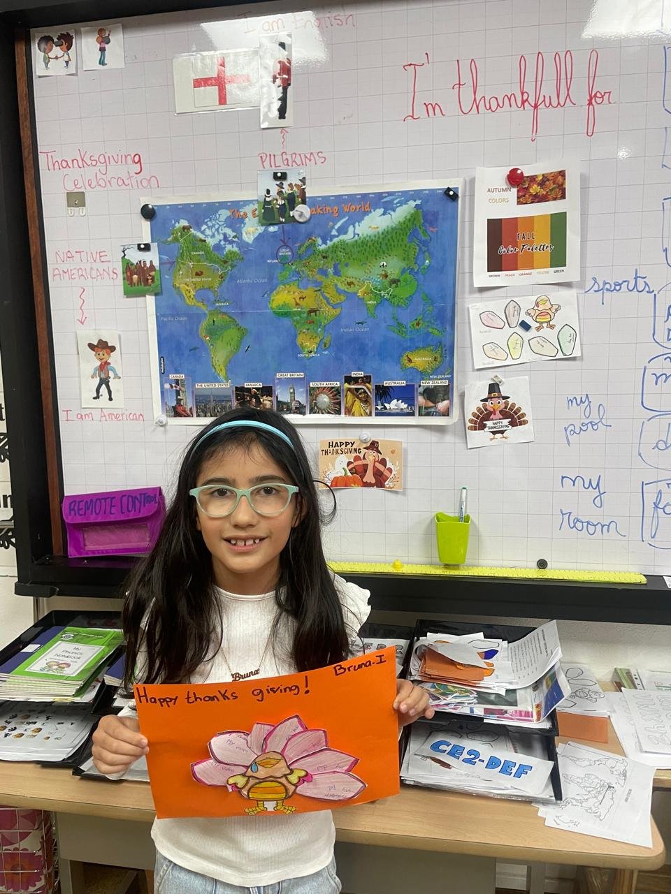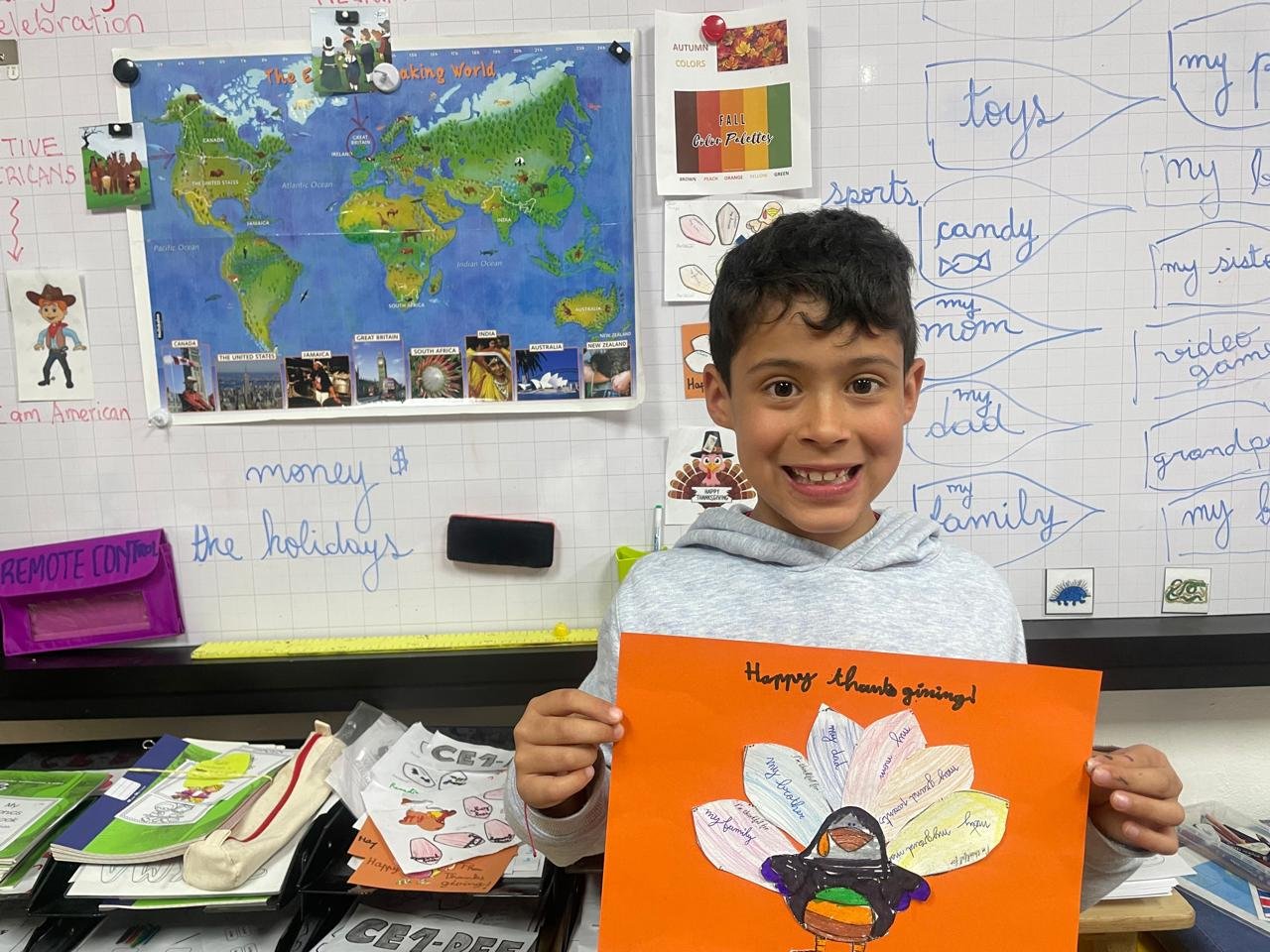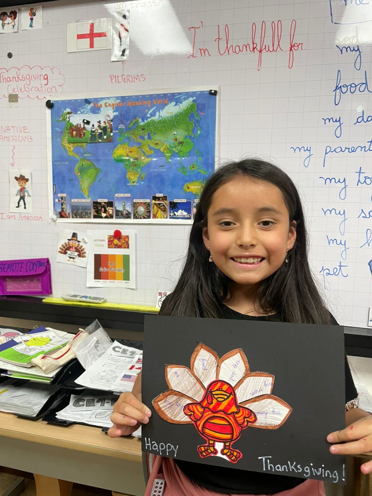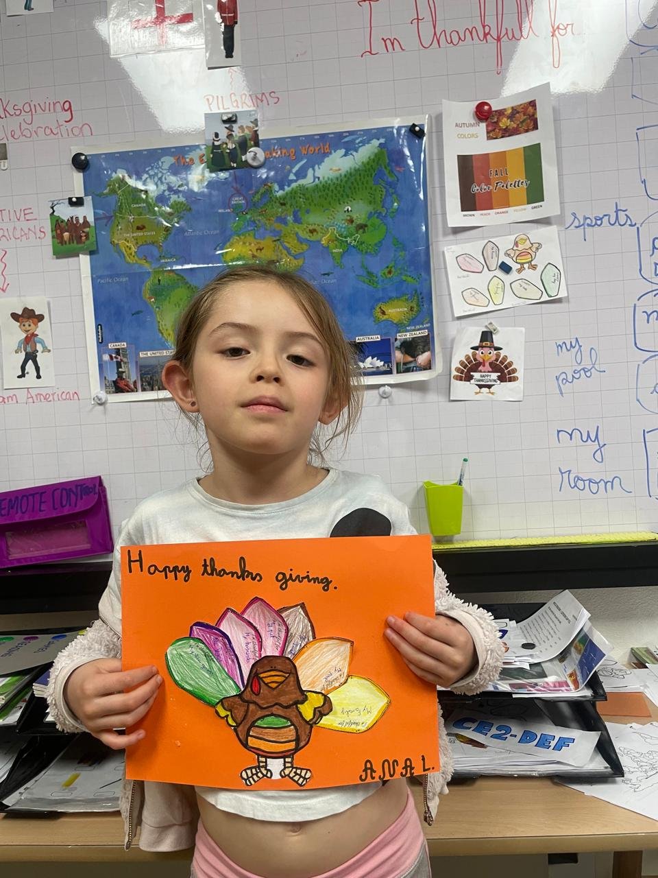 Autour de Thanksgiving, les élèves ont exploré les notions de gratitude, de partage et de solidarité. Ils ont réalisé des créations artistiques autour de la dinde de Thanksgiving, en utilisant du vocabulaire en anglais lié aux couleurs, aux émotions et à la reconnaissance.