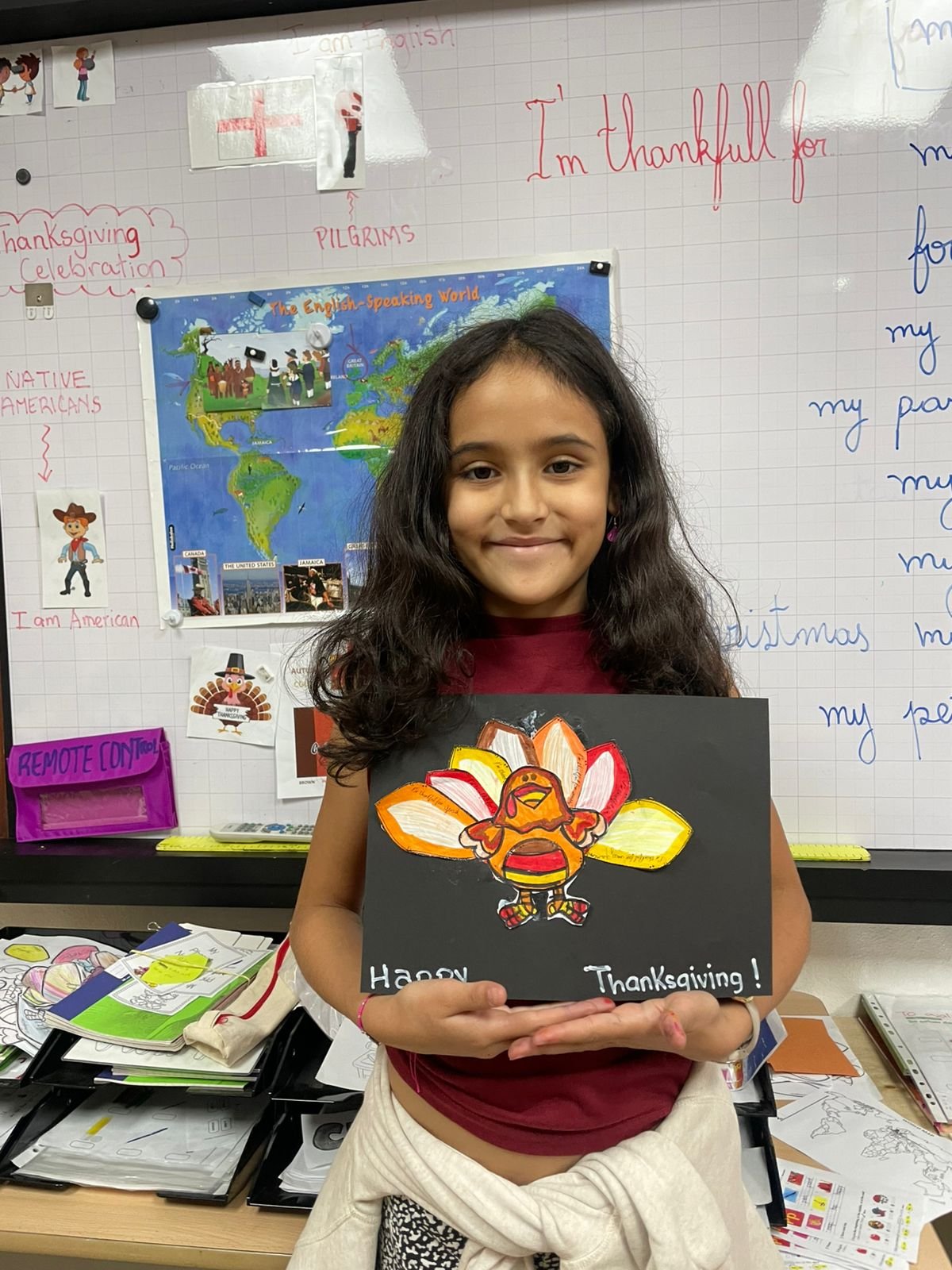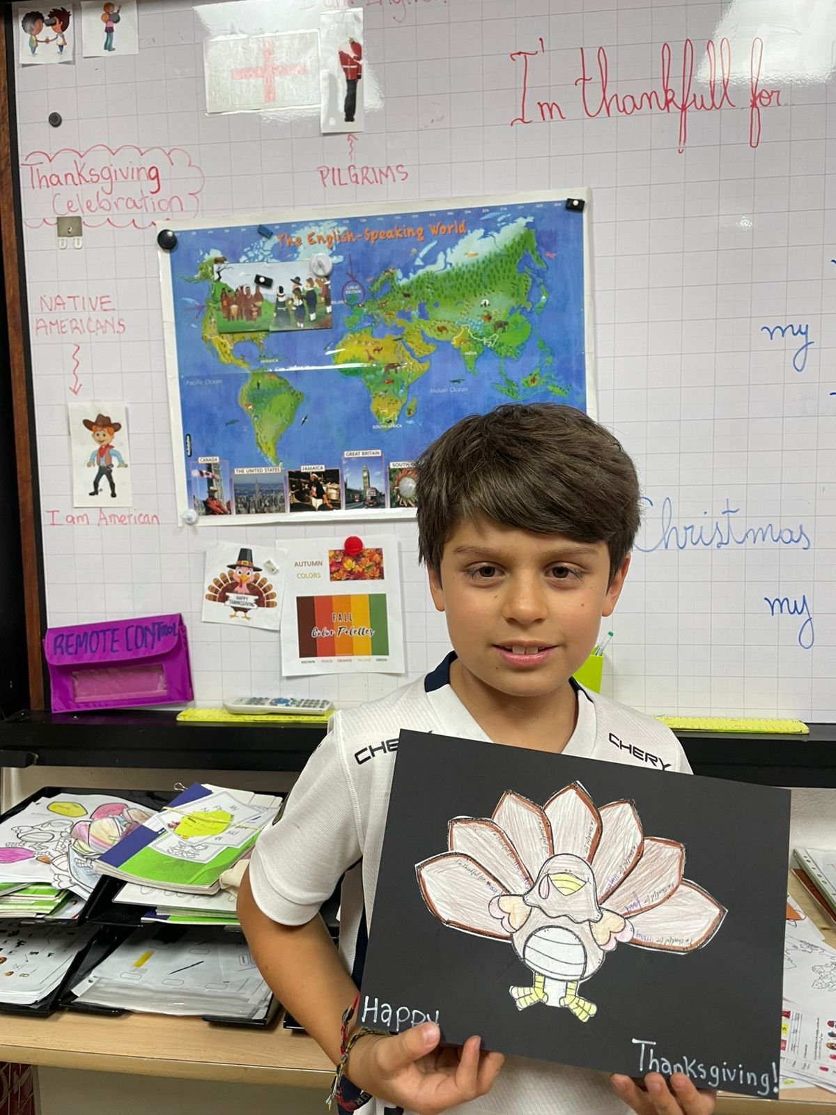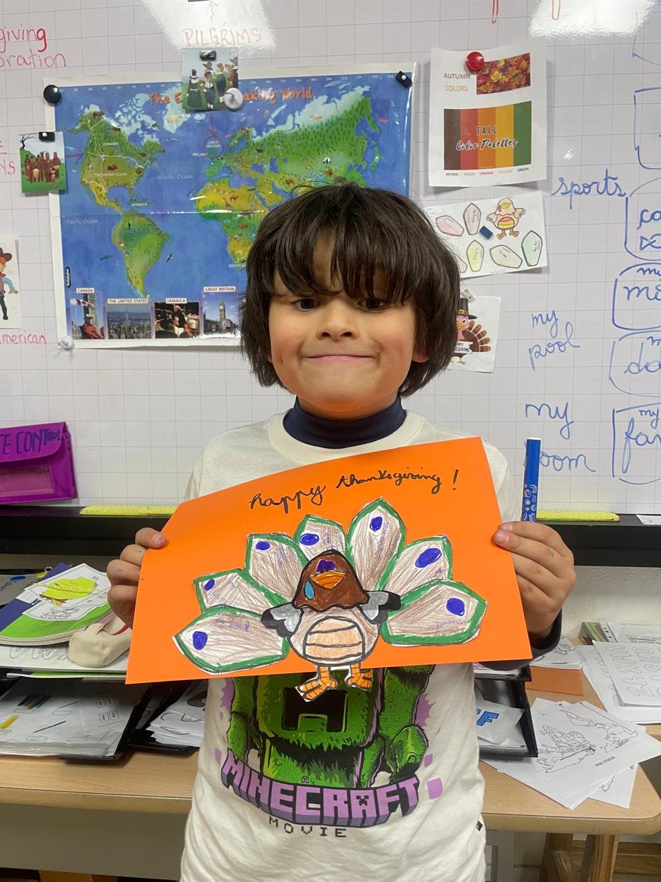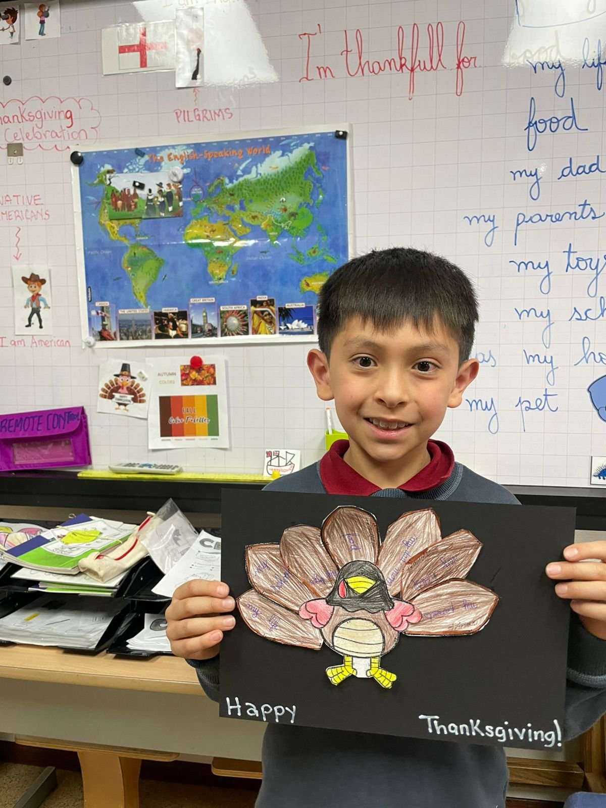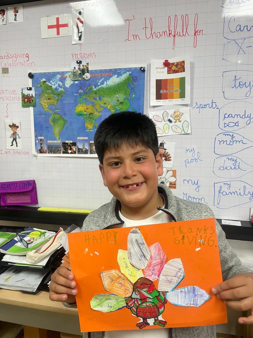 Autour de Thanksgiving, les élèves ont exploré les notions de gratitude, de partage et de solidarité. Ils ont réalisé des créations artistiques autour de la dinde de Thanksgiving, en utilisant du vocabulaire en anglais lié aux couleurs, aux émotions et à la reconnaissance.
