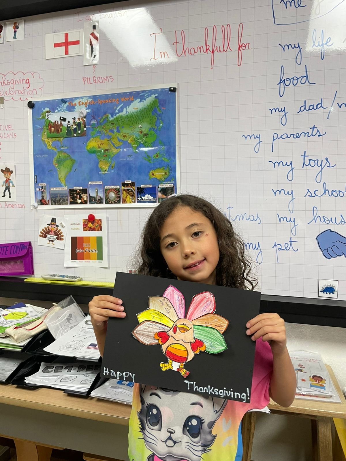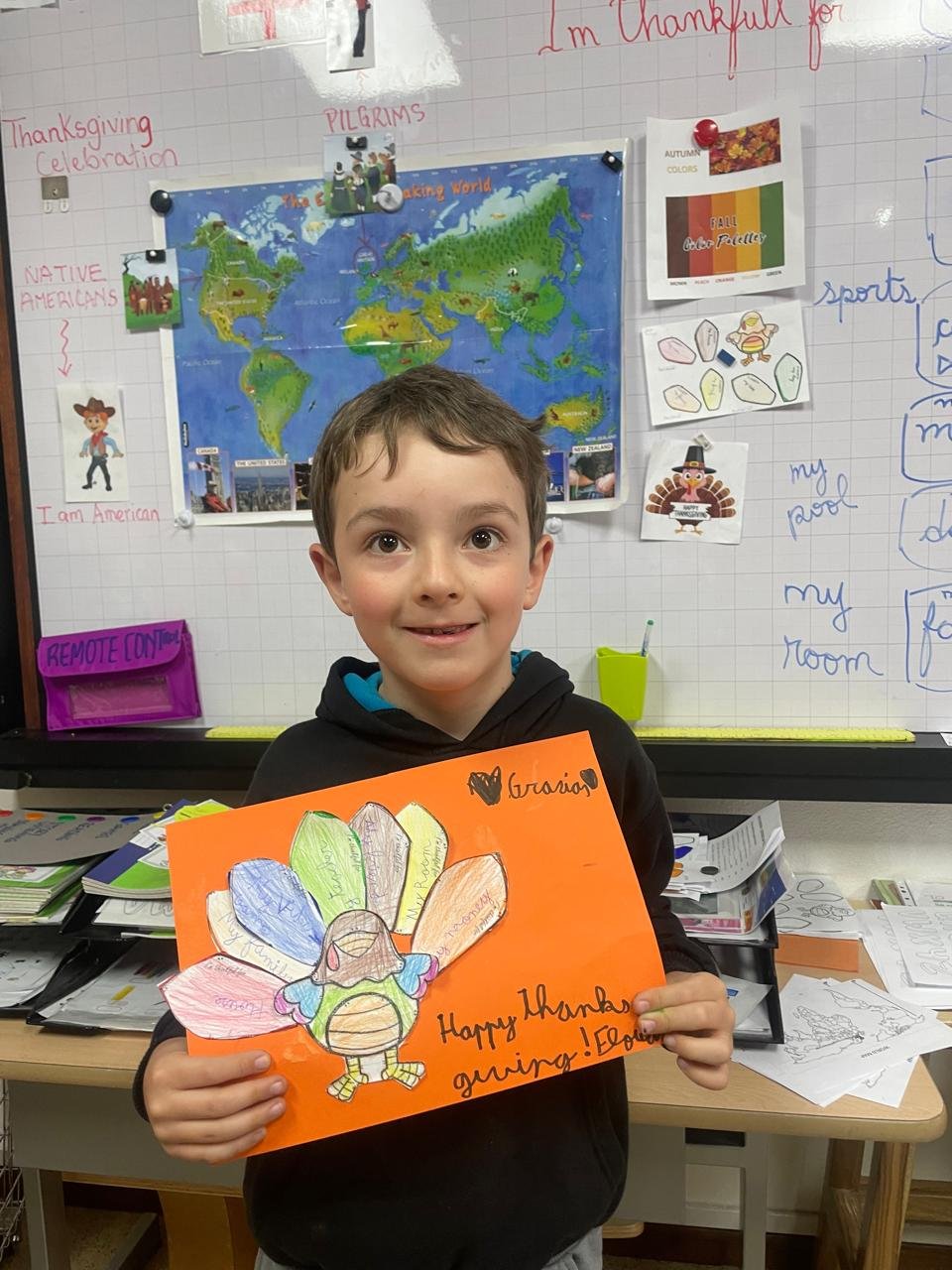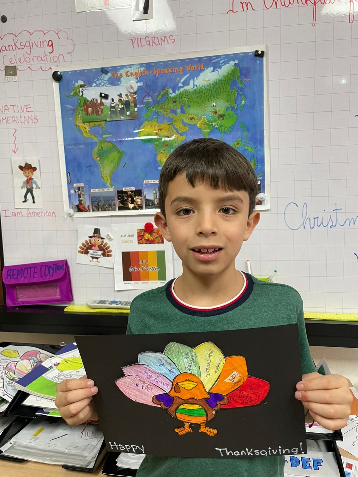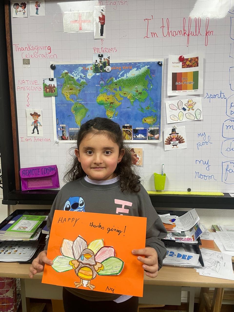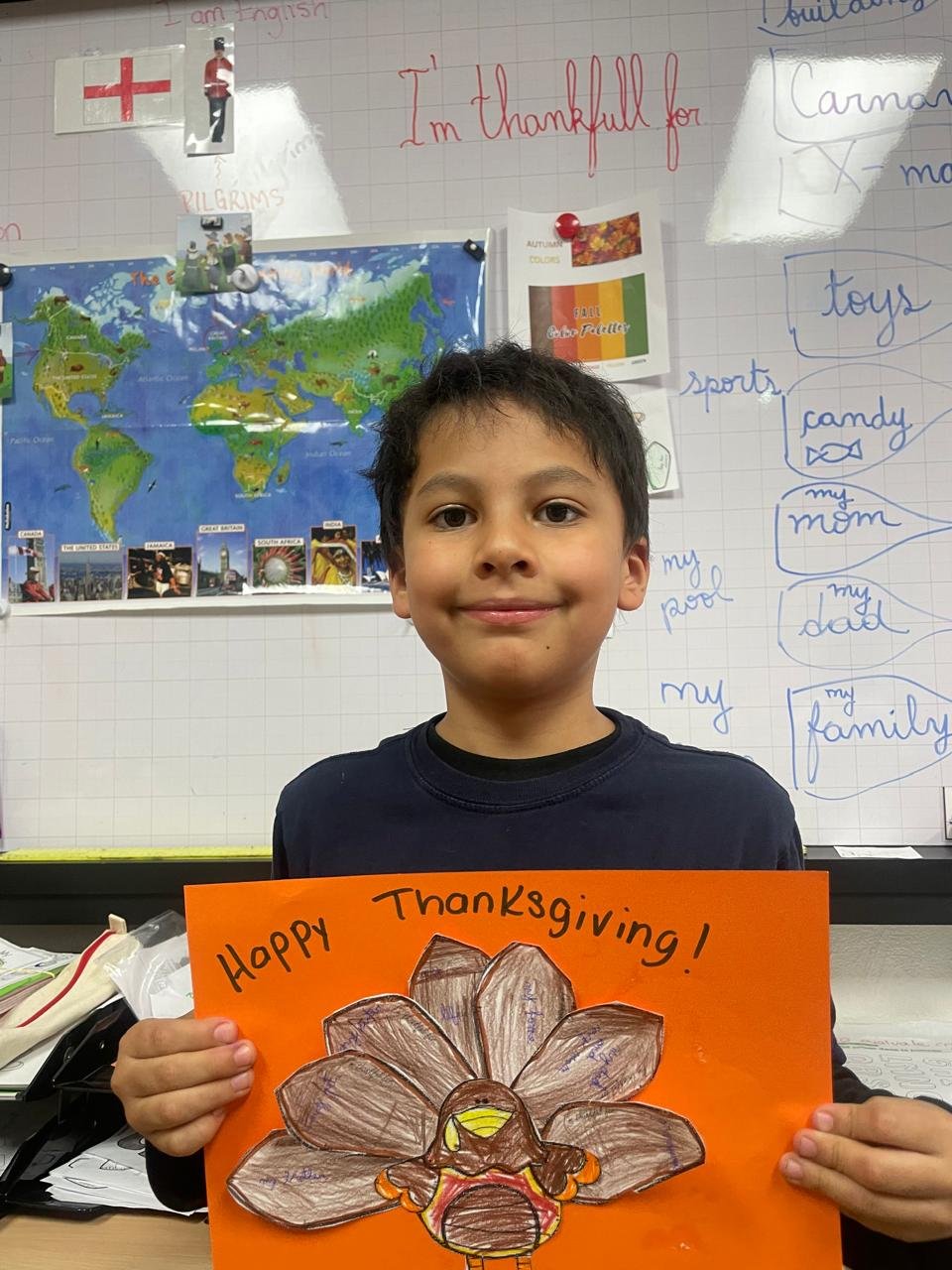 Autour de Thanksgiving, les élèves ont exploré les notions de gratitude, de partage et de solidarité. Ils ont réalisé des créations artistiques autour de la dinde de Thanksgiving, en utilisant du vocabulaire en anglais lié aux couleurs, aux émotions et à la reconnaissance.