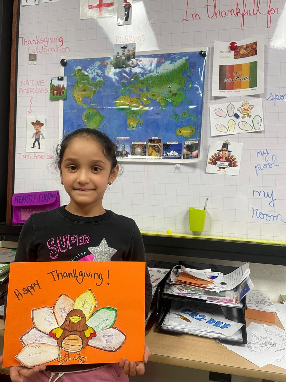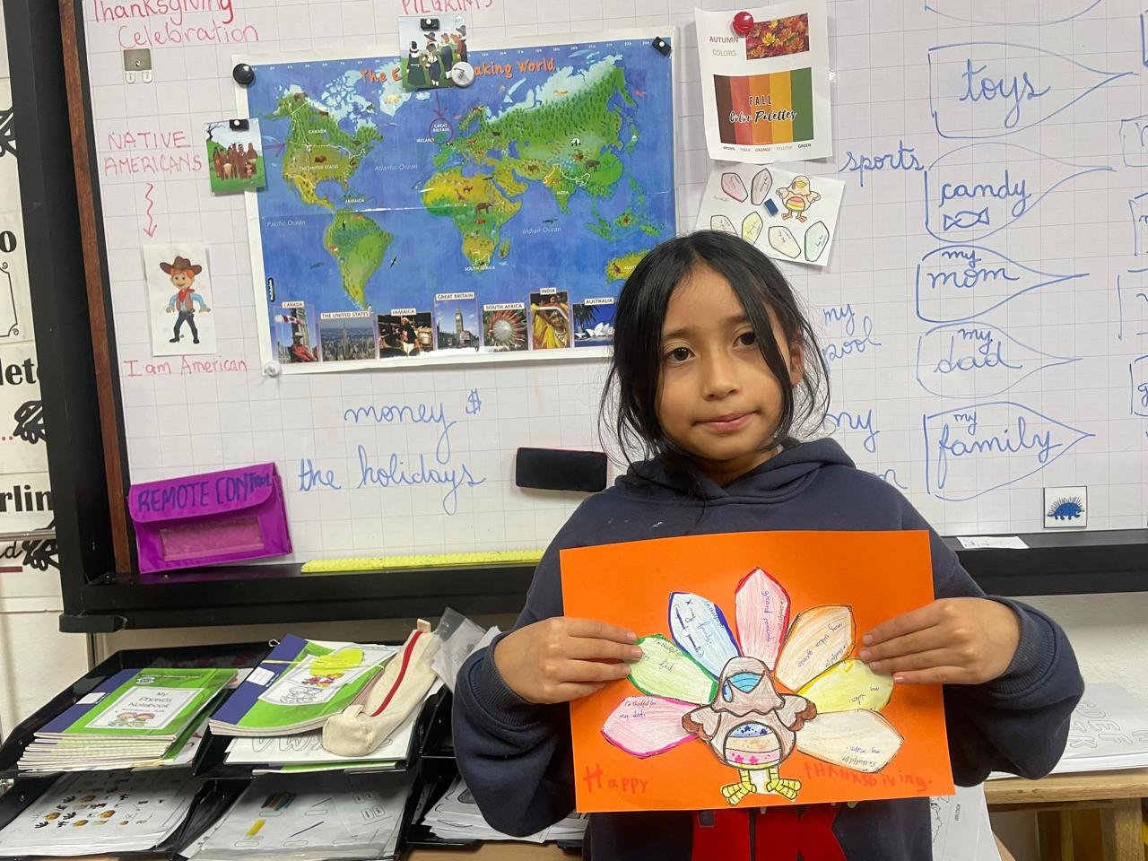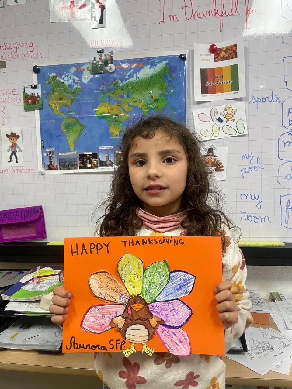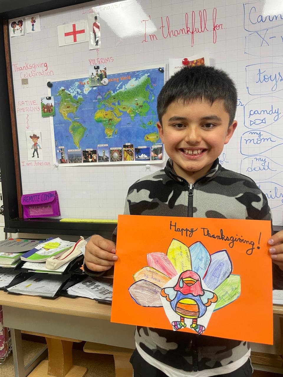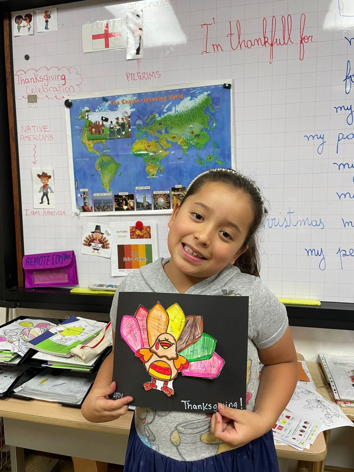 Autour de Thanksgiving, les élèves ont exploré les notions de gratitude, de partage et de solidarité. Ils ont réalisé des créations artistiques autour de la dinde de Thanksgiving, en utilisant du vocabulaire en anglais lié aux couleurs, aux émotions et à la reconnaissance.