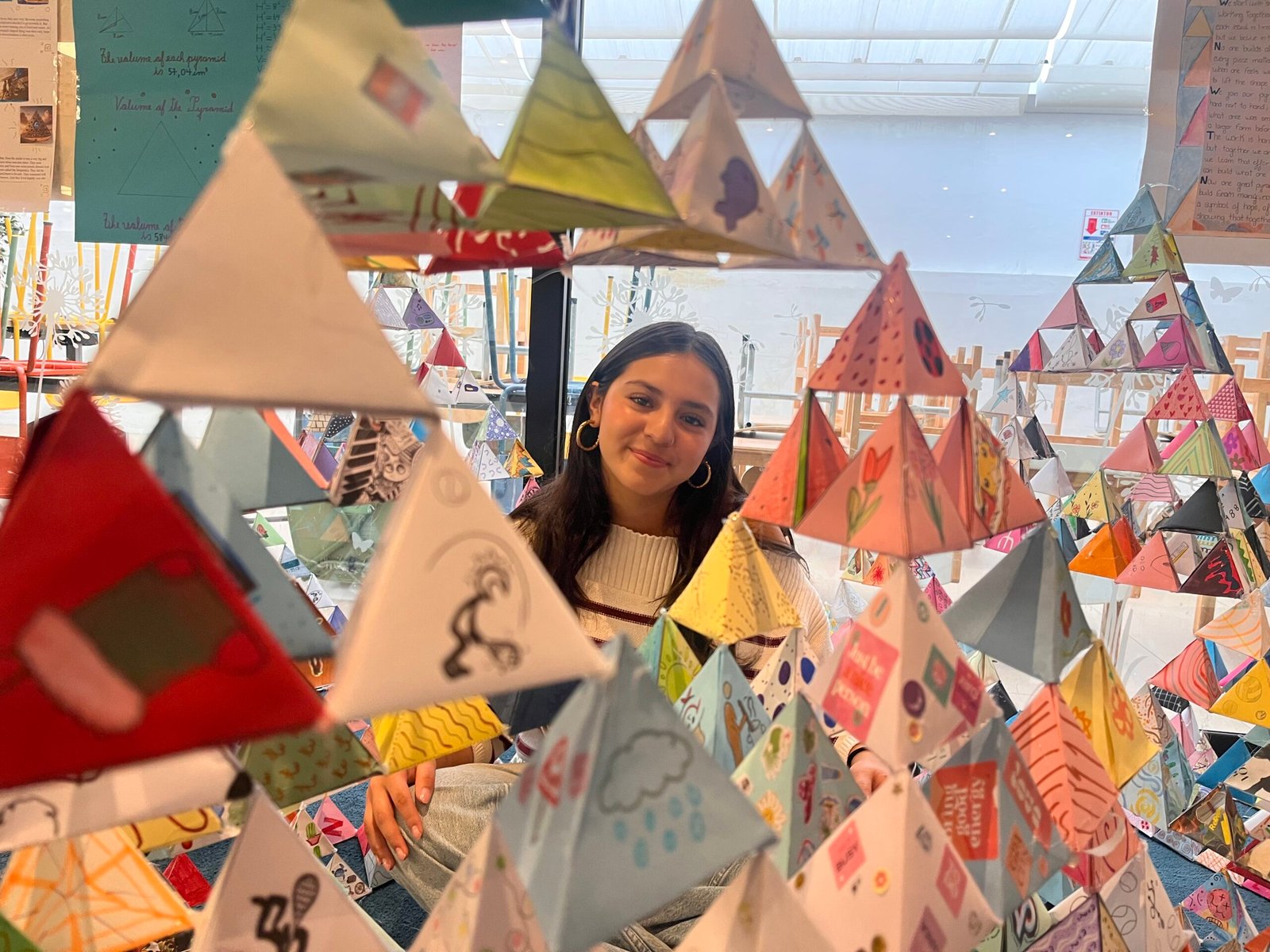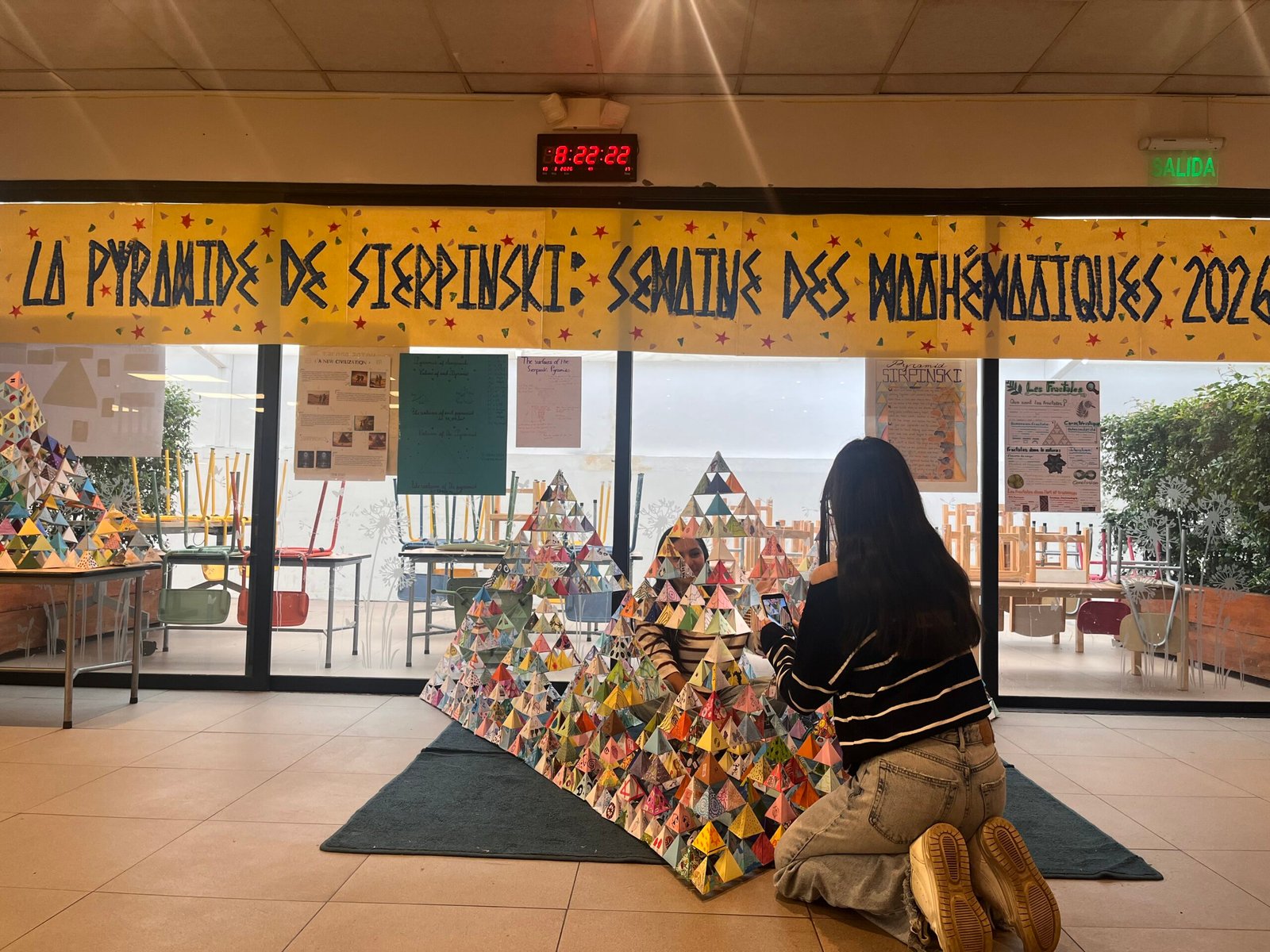 Parmi les projets les plus remarquables, la construction d’une pyramide de Sierpinski a particulièrement retenu l’attention. Réalisée par les élèves de 3ème et de Terminale, cette œuvre collective impressionnante est composée de 1024 pyramides, chacune de 8 cm de côté, soigneusement fabriquées et décorées par les élèves. Ce projet a permis de conjuguer rigueur mathématique et expression artistique, tout en favorisant le travail collaboratif.