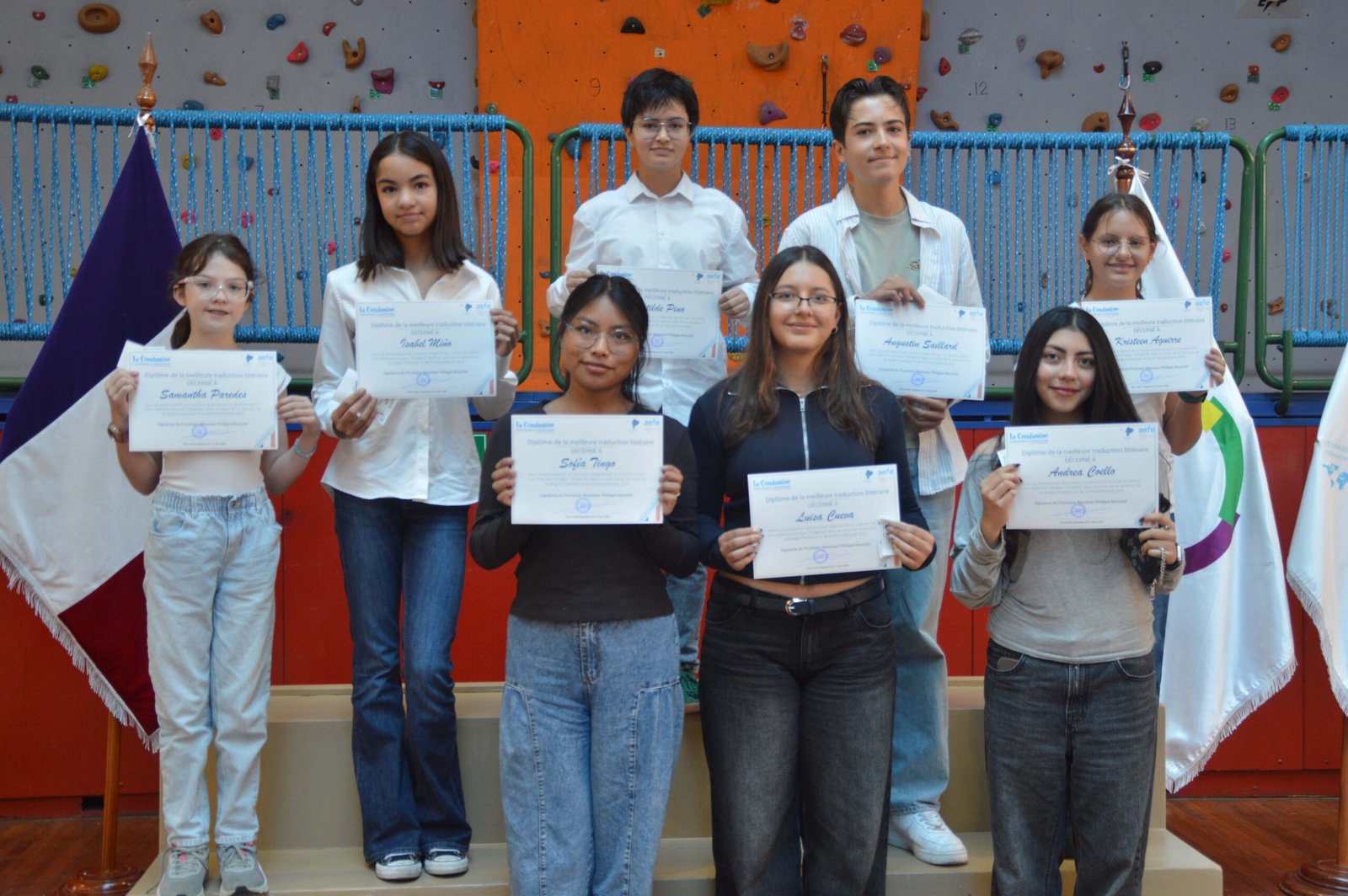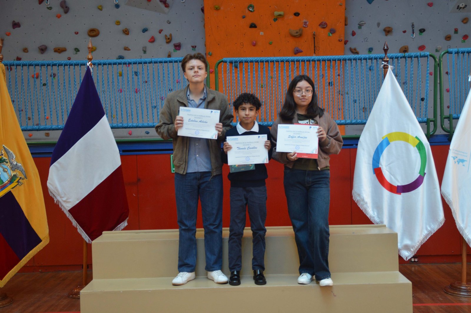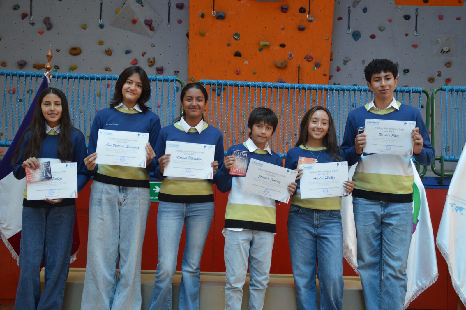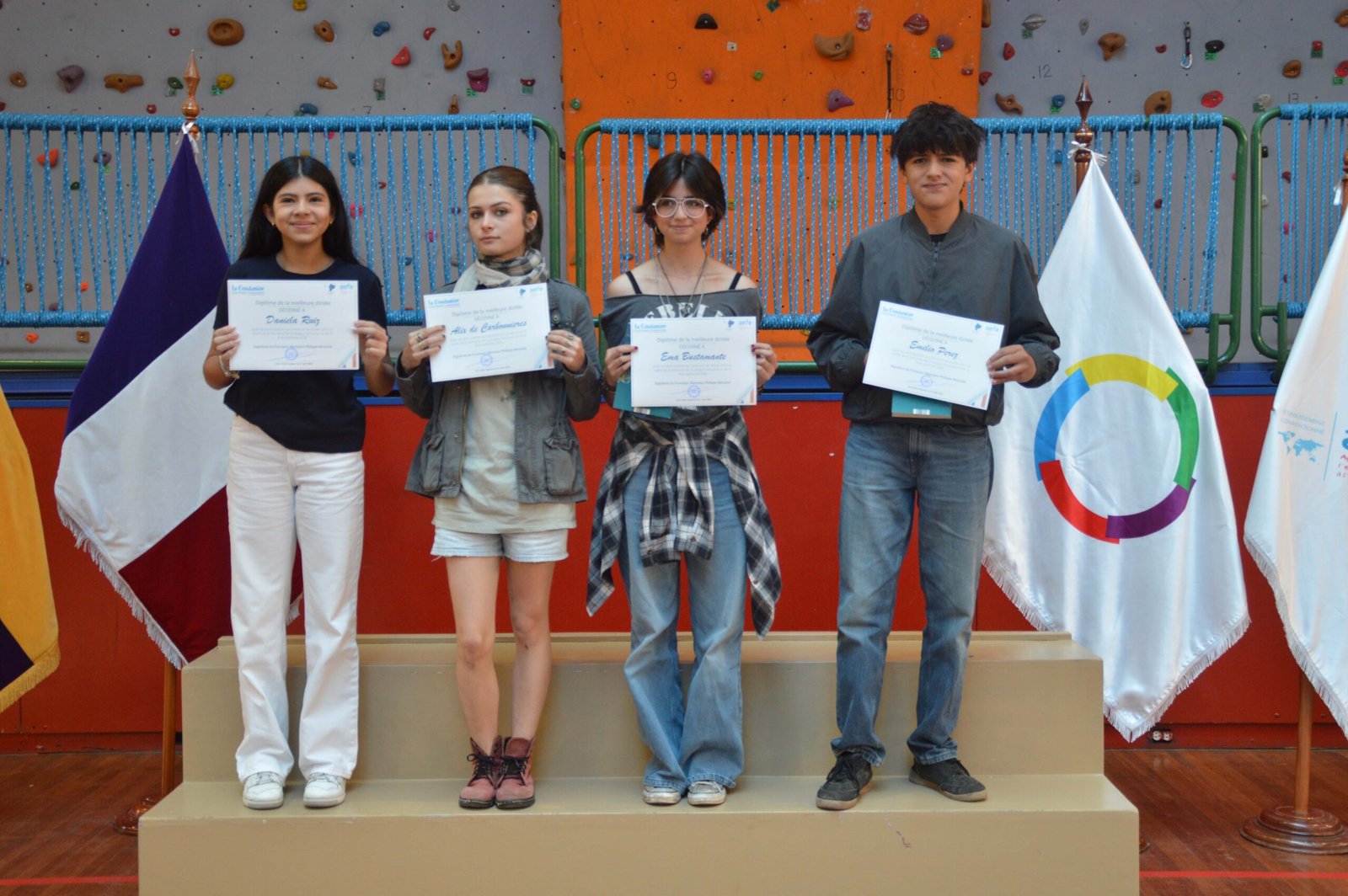 La célébration a débuté par une magnifique ouverture assurée par la chorale des élèves de 6ème et 5ème, qui ont accompagné la cérémonie de remise des diplômes du concours de dictée en français. Ce concours a réuni des élèves de plusieurs établissements, notamment le Liceo Campo Verde, le Colegio Francés et le Colegio Jean-Jacques Rousseau, renforçant les liens entre les écoles et valorisant la langue française.