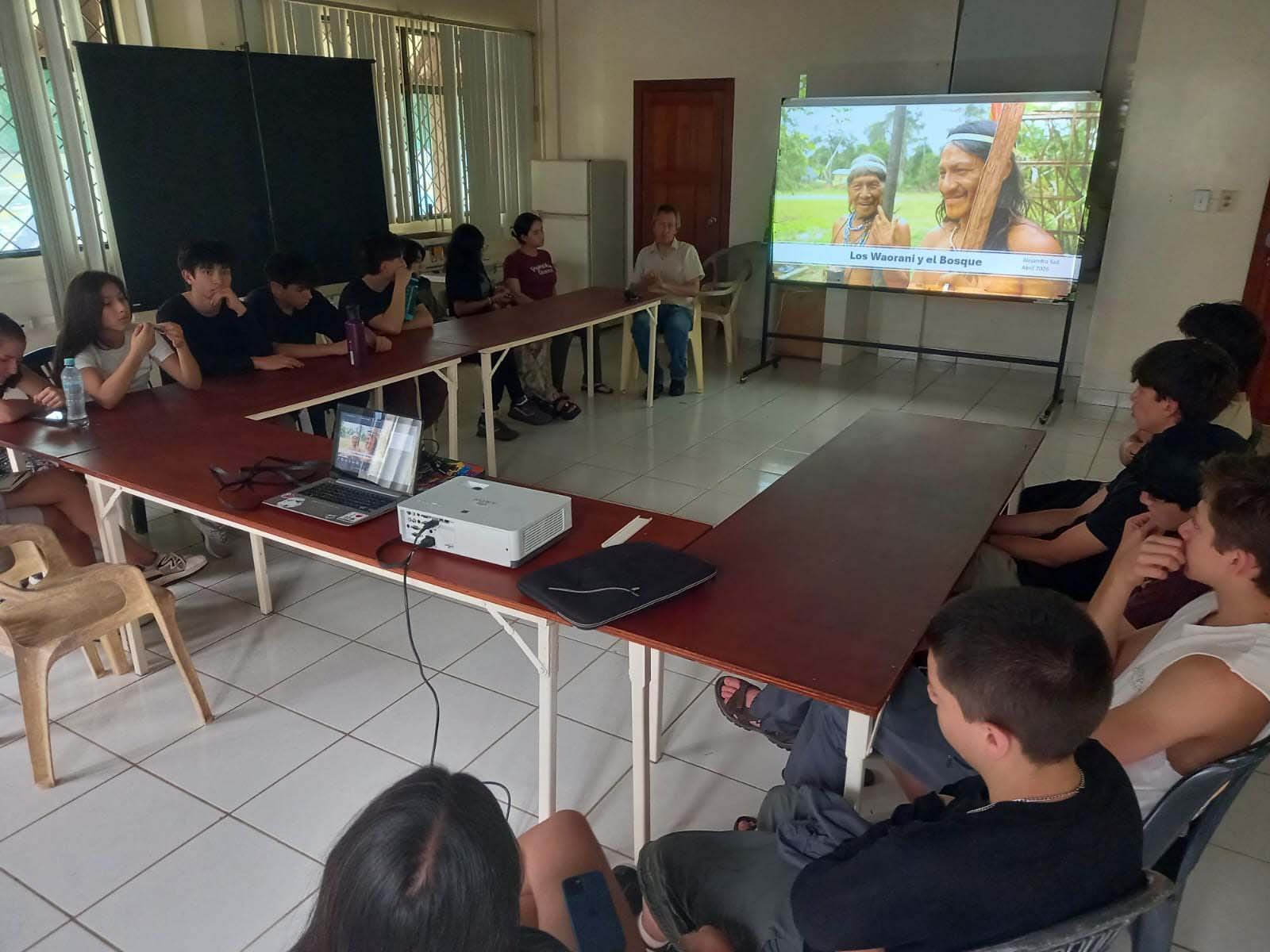 Le voyage a également comporté une forte dimension humaine et interculturelle. La visite de la communauté Waorani a donné lieu à un moment de partage et d’apprentissage mutuel : les élèves ont échangé avec les enfants autour d’un match de football et d’un troc d’artisanat. Ils ont également assisté à une présentation du projet d’éducation interculturelle bilingue, favorisant une réflexion sur la préservation des cultures ancestrales.