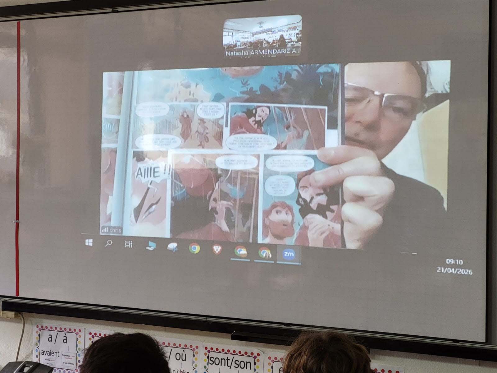 Par ailleurs, les élèves de C3-B et C3-C ont eu l’opportunité de participer à une rencontre virtuelle enrichissante avec l’auteur Christophe Lambert, créateur de la série La Agencia Pendergast. Après la lecture du premier tome, El príncipe de las tinieblas, ils ont pu échanger avec lui, approfondir leur compréhension de l’univers de l’œuvre et découvrir les coulisses de la création littéraire.